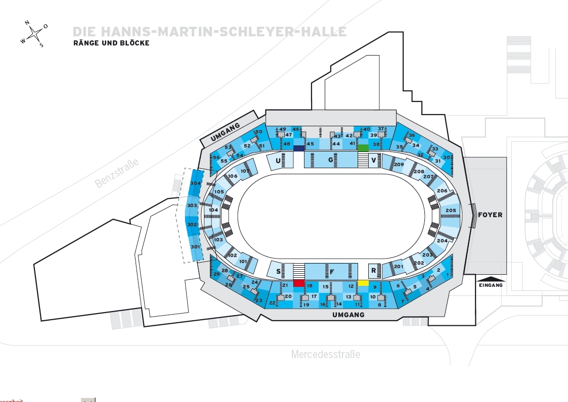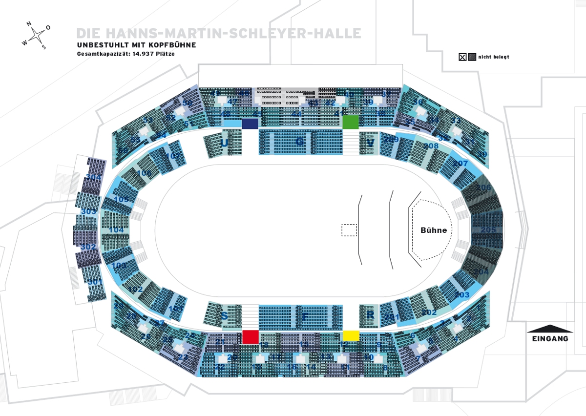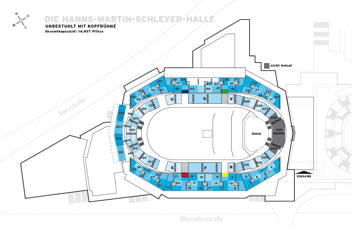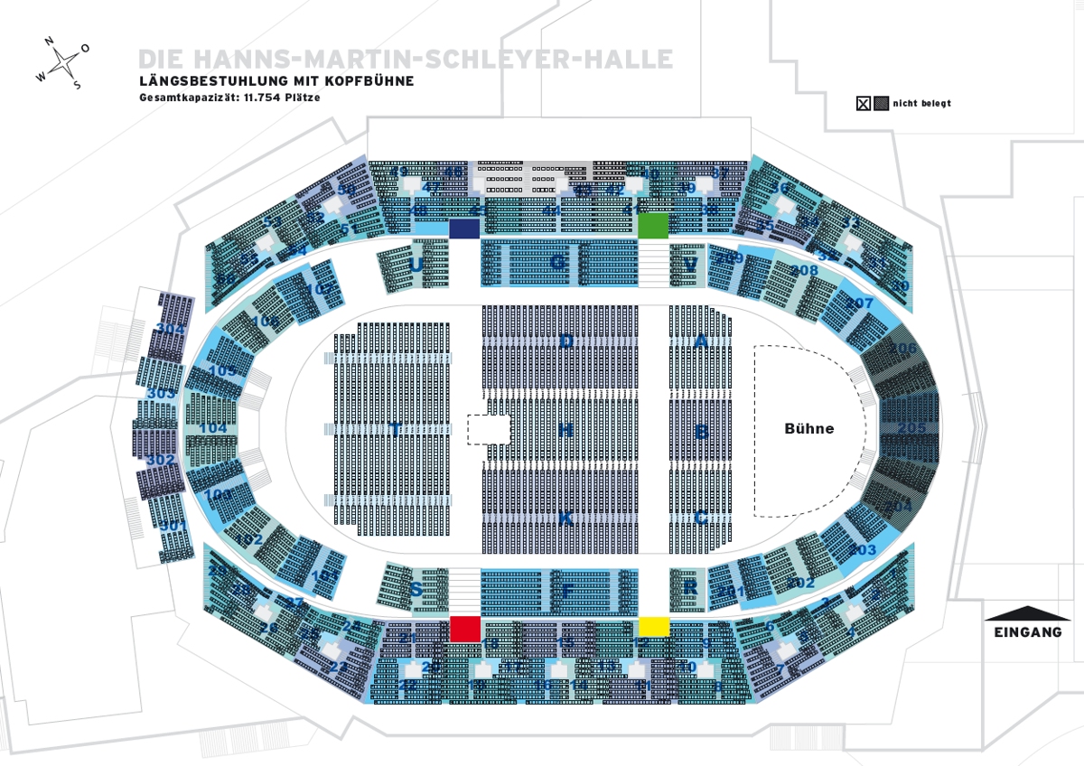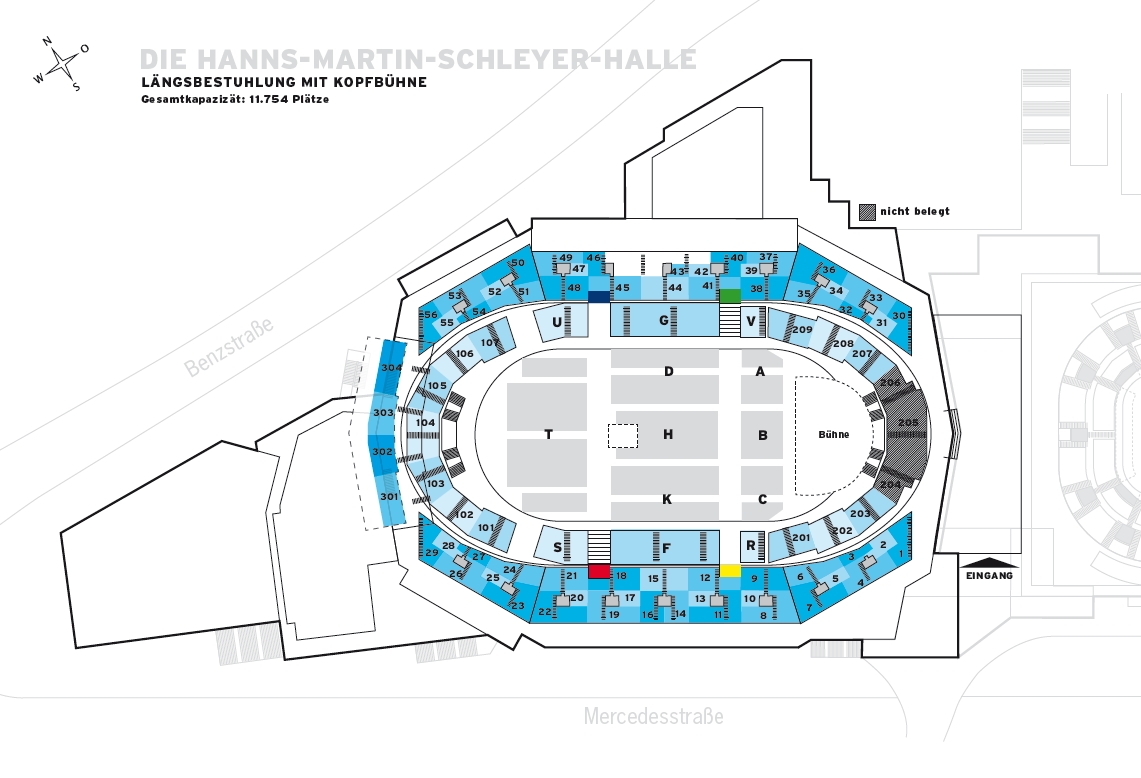 Insgesamt verfügt die Schleyer-Halle über 8.500 fest eingebaute Sitzplätze und hat eine Maximalkapazität von 15.500. Der 4.000 Quadratmeter große Innenraum bietet ausreichend Fläche für Steh- und zusätzliche Sitzplätze.