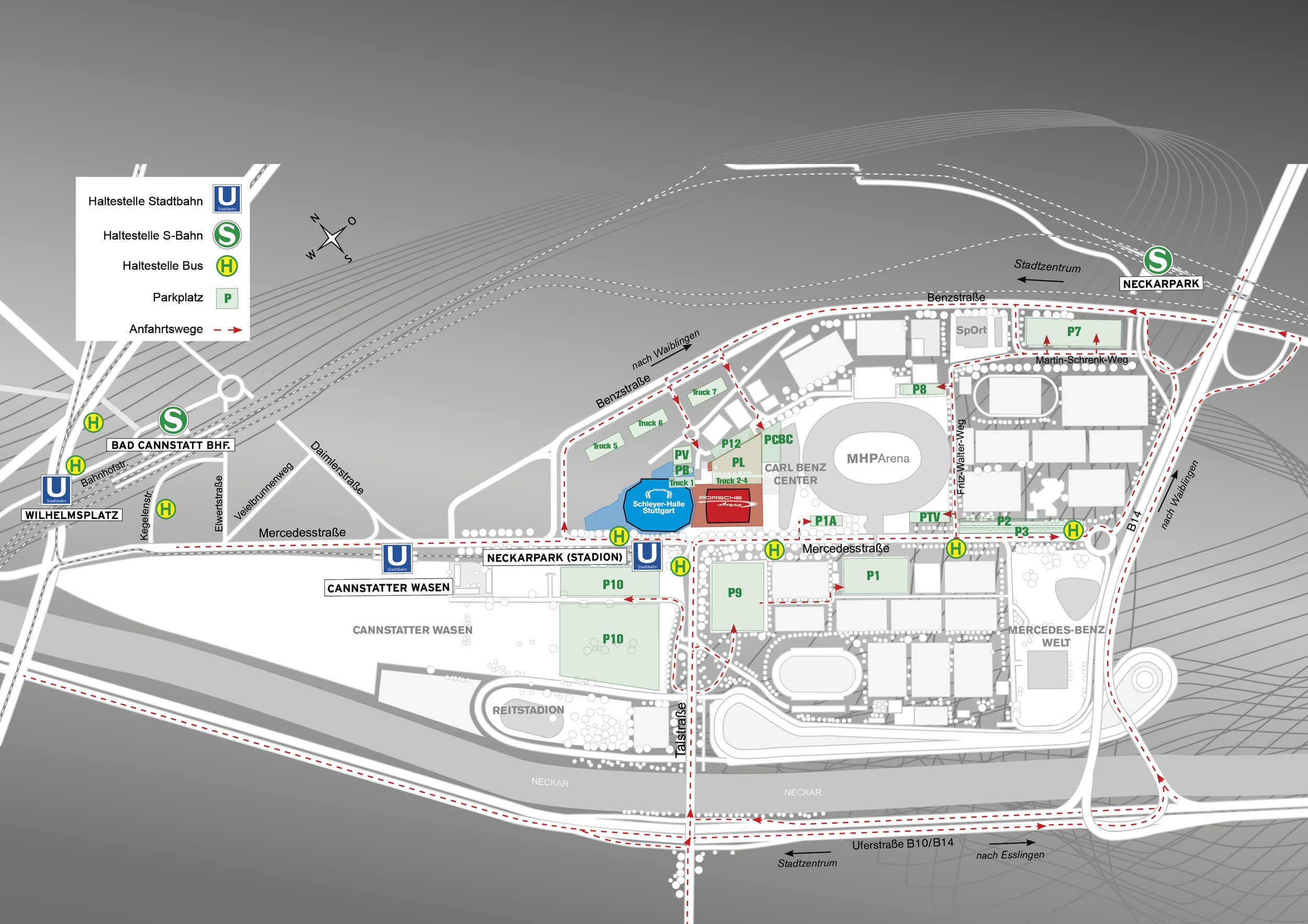 Die Hanns-Martin-Schleyer-Halle und die Porsche-Arena befinden sich in unmittelbarer Nähe der Mercedes-Benz Arena und sind bestens an den öffentlichen Personennahverkehr (ÖPNV) angeschlossen. Dazu gehören die beiden S-Bahn-Stationen „Bahnhof Bad Cannstatt“ und „NeckarPark (Mercedes-Benz)“. Die U-Bahn-Station und die Bushaltestelle „NeckarPark (Stadion)“ befinden sich in unmittelbarer Nähe zum Haupteingang des Hallenduos.