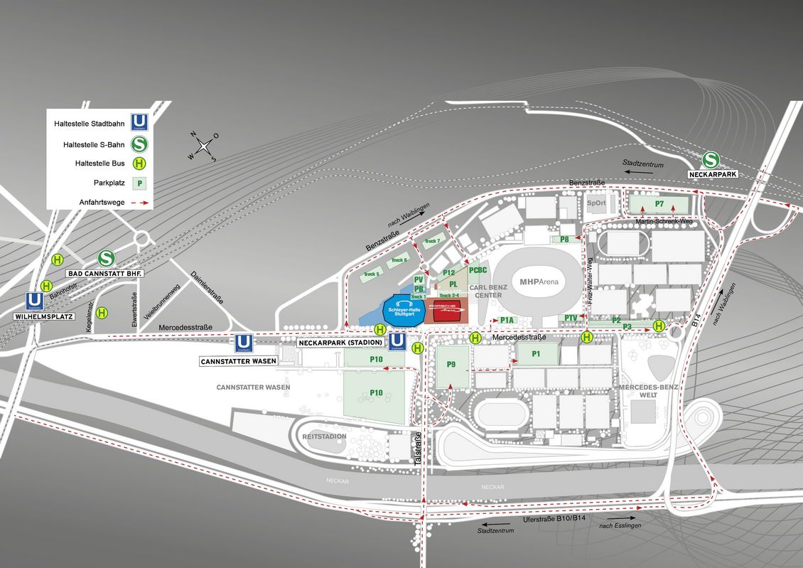 Die Anlieferung für das Hallenduo im NeckarPark mit der Hanns-Martin-Schleyer-Halle und der Porsche-Arena erfolgt zentral über die Zufahrt in der Benzstraße.