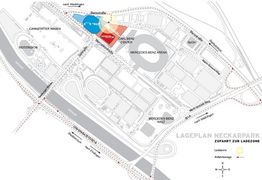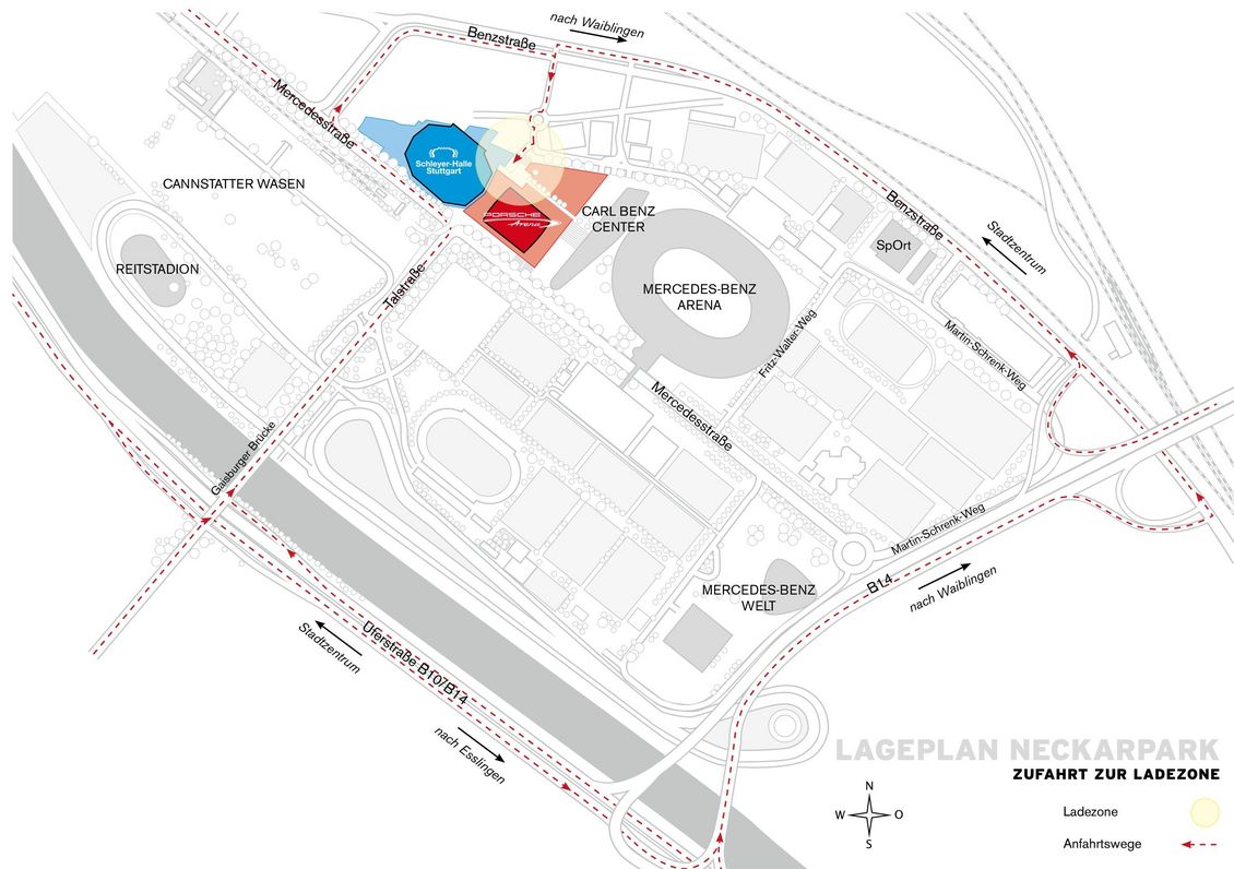 The delivery for the Hallenduo in the NeckarPark with the Hanns-Martin-Schleyer-Hall and the Porsche-Arena takes place centrally via the access road at the Benzstraße.